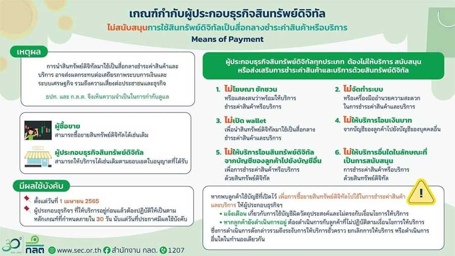 ก.ล.ต. ประกาศ ห้ามใช้สินทรัพย์ดิจิทัลชำระค่าสินค้าและบริการ มีผล 1 เมษายนนี้
