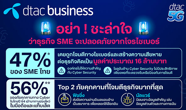 - ดีแทค บิสิเนส เปิดตัวบริการ dtac Mobile Security โซลูชันล่าสุดสำหรับกลุ่มธุรกิจองค์กรขนาดเล็กและขนาดกลาง ช่วยป้องกันข้อมูลสำคัญทางธุรกิจไม่ให้ถูกโจมตีจากภัยคุกคามทางไซเบอร์