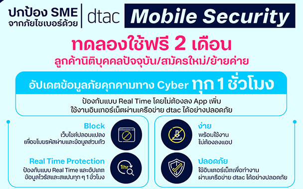 dtac Mobile Security เป็นระบบที่ช่วยป้องกันธุรกิจจากภัยคุกคามไซเบอร์ เช่น ฟิชชิ่ง มัลแวร์ ฯลฯ ทำให้ผู้ใช้งานเข้าเว็บไซต์ต่าง ๆ ผ่านทางโทรศัพท์มือถือได้อย่างปลอดภัย เมื่อสมัครใช้งานระบบ dtac Mobile Security หากผู้ใช้งานมีการเข้าเว็บไซต์ที่สุ่มเสี่ยงเป็นภัยคุกคามทางไซเบอร์ผ่านมือถือหรือแท็บเล็ต ระบบจะทำการบล็อก เพื่อป้องกันไม่ให้ผู้ใช้งานเข้าสู่เว็บไซต์เหล่านั้นได้ เหมาะสำหรับกลุ่มธุรกิจองค์กรขนาดเล็กและขนาดกลาง