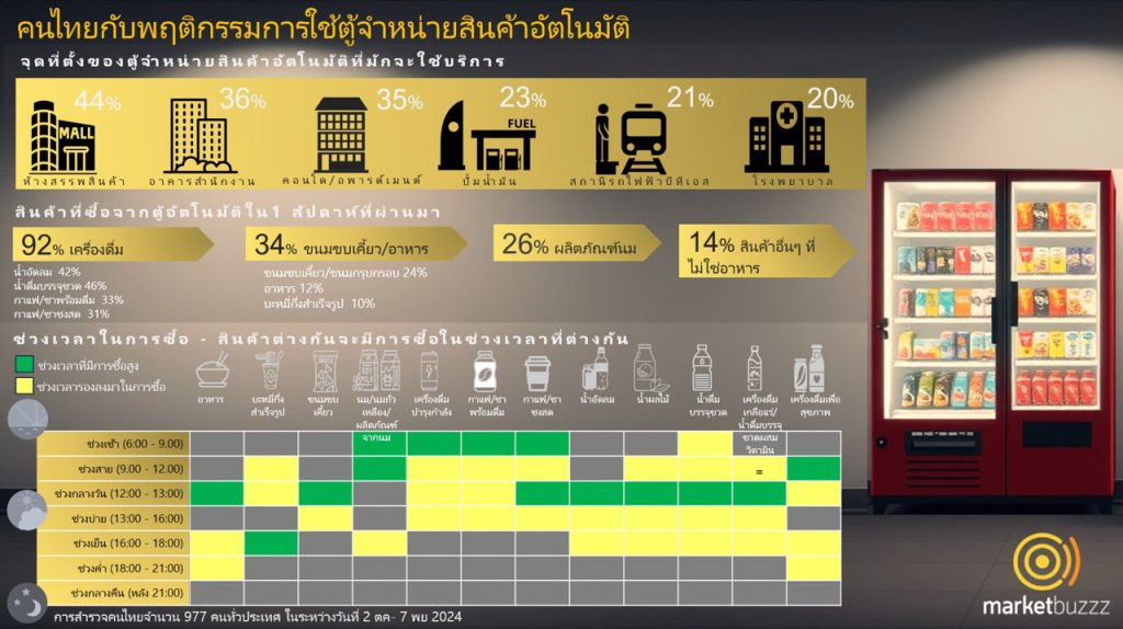 ข้อมูลล่าสุดจากผลสำรวจของมาร์เก็ตบัซซ บริษัทที่ปรึกษาวิจัยตลาดชั้นนำด้านการวิเคราะห์ตลาดผ่านการสำรวจบนมือถือ เผยให้เห็นถึงการใช้งานตู้จำหน่ายสินค้าอัตโนมัติในประเทศไทยอย่างแพร่หลาย โดยได้สำรวจคนไทยทั่วประเทศจำนวน 977 คน ระหว่างวันที่ 2 ตุลาคม – 7 พฤศจิกายน 2567 โดยผลการสำรวจนี้ได้เน้นแสดงให้เห็นถึงความนิยมของผู้บริโภคที่เพิ่มขึ้นอย่างต่อเนื่องต่อการใช้โซลูชั่นค้าปลีกอัตโนมัติ