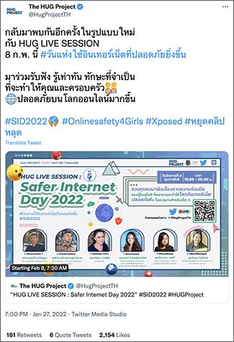 สำหรับประเทศไทย ทวิตเตอร์ได้ร่วมกับโครงการของ HUG ประเทศไทย (@HugProjectTH) ในการจัดไลฟ์สตรีมมิ่งเพื่อพูดคุยกันในเรื่องของความปลอดภัยบนโลกออนไลน์ในวันอังคารที่ 8 กุมภาพันธ์ เวลา 19.30 น.- 20.40 น. อีกด้วย