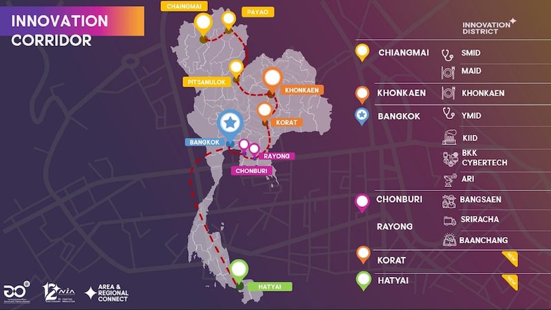 ผู้อำนวยการ NIA กล่าวว่า ปัจจุบันมีย่านนวัตกรรม 8 แห่ง โดยแบ่งเป็นพื้นที่ในกรุงเทพฯ 4 แห่ง คือ ย่านนวัตกรรมการแพทย์โยธี (Yothi Medical Innovation District: YMID), ย่านนวัตกรรมไซเบอร์เทค (Bangkok Cybertech District), ย่านนวัตกรรมอารีย์ (ARI Innovation District ) และย่านนวัตกรรมกล้วยน้ำไท (Kluaynamthai Innovative Industries District: KIID)