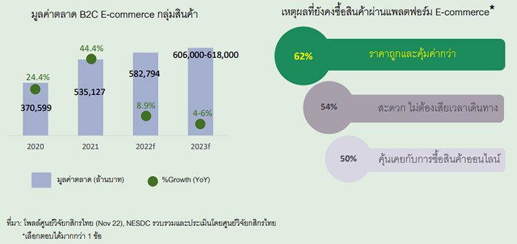 ภาพการเติบโตที่ชะลอตัวนี้จะยังเกิดขึ้นต่อเนื่องไปในปี 2566 ซึ่งคาดว่าจะขยายตัวราว 4-6% หรือคิดเป็นมูลค่าตลาดประมาณ 606,000 – 618,000 ล้านบาท โดยจำนวนผู้ที่เข้ามาใช้บริการ E-Commerce รายใหม่ๆ น่าจะเริ่มอิ่มตัว หลังจากที่มีการเข้ามาใช้บริการจำนวนมากในช่วงก่อนหน้านี้ที่มีการระบาดของโควิด-19 รุนแรง อีกทั้งกำลังซื้อของผู้บริโภคที่ยังได้รับผลกระทบจากปัจจัยกดดันต่าง ๆ ไม่ว่าจะเป็นค่าครองชีพหรือเงินเฟ้อ ส่งผลให้มองว่า การเติบโตของธุรกิจ E-Commerce หลัก ๆ น่าจะไม่ได้เกิดจากค่าใช้จ่ายในภาพรวมของผู้บริโภคที่เพิ่มขึ้น แต่เป็นการปรับพฤติกรรมการซื้อสินค้าจากหน้าร้าน (Physical store) มาเป็นแพลตฟอร์มออนไลน์ (E-Commerce)