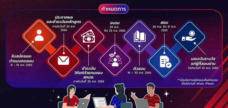 ทั้งนี้ ผู้ที่สนใจ สามารถสมัครผ่านช่องทาง https://forms.gle/ch7s99wvsw52kSdr8 หรือ QR Code ได้ตั้งแต่วันนี้จนถึงวันศุกร์ที่ 19 สิงหาคม 2565 เวลา 24:00 น. และจะได้รับอีเมลยืนยันสิทธิ์ และ link ในการทำข้อสอบภายในวันที่ 20 สิงหาคม 2565 และสามารถเข้าทำข้อสอบได้พร้อมกันในวันที่ 21 สิงหาคม 2565 ตั้งแต่เวลา 10:00 น. โดยมีเกณฑ์การพิจารณาคนที่จะได้รับสิทธิ์เข้าฝึกอบรม และสอบประกาศนียบัตร CompTIA ทั้ง 5 หลักสูตร คือจะต้องได้คะแนนไม่น้อยกว่า 80% ภายในระยะเวลาที่เร็วที่สุด หรือตามเงื่อนไขที่ สกมช. กำหนด ซึ่งผู้ที่ได้รับคัดเลือกจะต้องเข้าฝึกอบรมแบบ on-site ตามวัน เวลา และสถานที่ ที่ สกมช. กำหนด
