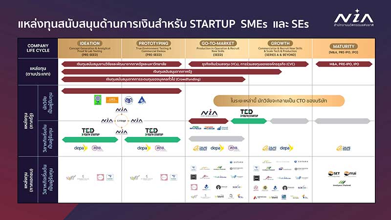สํานักงานนวัตกรรมแห่งชาติ (องค์การมหาชน) หรือ NIA และกองทุนพัฒนาผู้ประกอบการเทคโนโลยีและนวัตกรรม (TED Fund) เปิดตัวกลไกการสนับสนุนด้านเงินรูปแบบใหม่ สำหรับผู้ประกอบการเทคโนโลยีและนวัตกรรมจากความร่วมมือของแหล่งทุนภาครัฐและเอกชน เพื่อสร้างโอกาสการเข้าถึงแหล่งเงินทุน ให้กับสตาร์ตอัพไทยในระยะเริ่มต้นและระยะเติบโต ให้สามารถพัฒนาต้นแบบและขยายผลสู่เชิงพาณิชย์ได้อย่างเป็นรูปธรรม โดยมีงบอุดหนุนจากภาครัฐและเอกชนรวมกว่า 200 ล้านบาท คาดว่าจะสร้างให้เกิดมูลค่าของธุรกิจนวัตกรรมกว่า 1,000 ล้านบาท รวมถึงการผลักดันประเทศไทยให้ก้าวสู่การเป็นประเทศแห่งนวัตกรรม