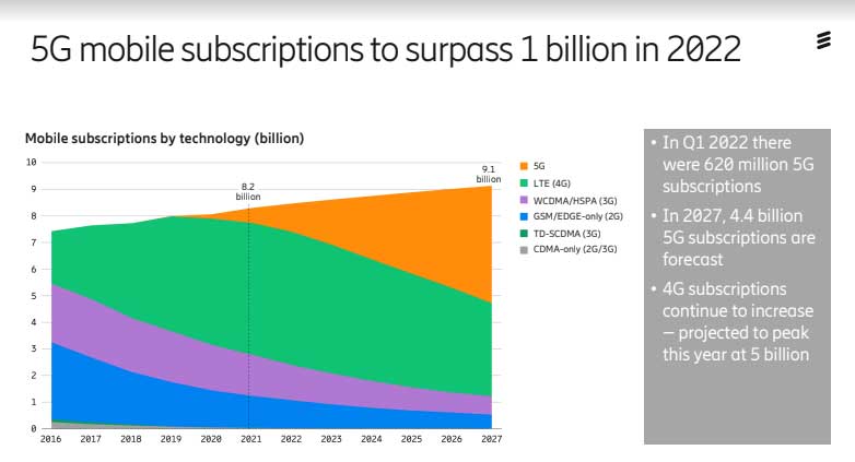 รายงาน Ericsson Mobility Report เดือนมิถุนายน ปี 2565 ตอกย้ำให้เห็นว่าการเติบโตของ 5G เป็นเจนเนอเรชั่นเครือข่ายไร้สายที่มีการนำมาใช้งานรวดเร็วกว่าเทคโนโลยีมือถือรุ่นก่อน ๆ ทั้งหมด โดยเวลานี้หนึ่งในสี่ของประชากรโลกสามารถเข้าถึงเครือข่าย 5G ได้ และเพียงช่วงไตรมาสแรกของปี 2565 มีจำนวนการสมัครใช้บริการ 5G เพิ่มขึ้นประมาณ 70 ล้านบัญชี ซึ่งตามรายงานยังระบุว่า ภายในปี 2570 ประชากรทั่วโลก 3 ใน 4 จะสามารถเข้าถึง 5G ได้