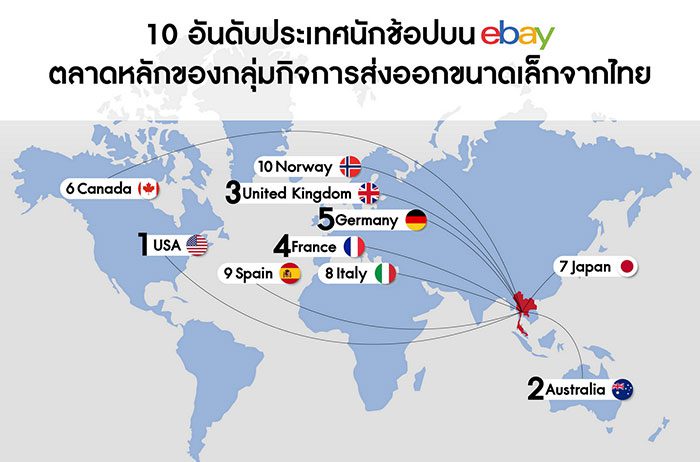 โดยรวมแล้ว กิจการขนาดเล็กบนอีเบย์ในภูมิภาคเอเชียตะวันออกเฉียงใต้ขายสินค้าไปยัง 214 ประเทศในปี 2563 ในจำนวนนี้ มีร้อยละ 64 ที่สามารถก้าวขึ้นเป็นผู้ขายระดับโลก (eBay Global Sellers) จากการส่งออกไปทวีปต่าง ๆ อย่างน้อย 4 ทวีป ซึ่งเอสเอ็มอีไทยประสบความสำเร็จมากกว่าอัตราเฉลี่ย โดยมีผู้ขายไทยที่เป็นกิจการขนาดเล็กบนอีเบย์ ร้อยละ 75 ขายสินค้าส่งออกไปอย่างน้อย 4 ทวีป และสัดส่วนร้อยละ 76 ที่สามารถส่งออกสินค้าไปยังมากกว่า 10 ประเทศปลายทาง