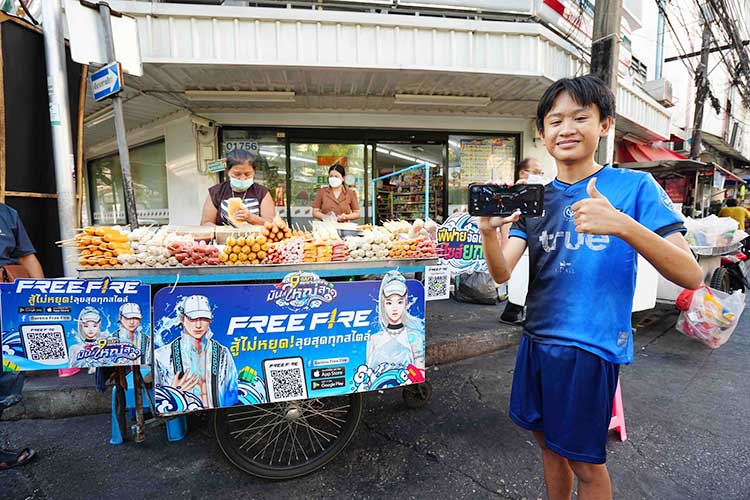 - ไฮไลต์แรก Wrap รถเข็นขายอาหารเจ้าเด็ด ชวนคอเกมทั้งเก่าและใหม่เข้ามาเล่น Free Fire อาทิ รถ ขายลูกชิ้นปิ้ง ไส้กรอกทอด โตเกียว พร้อมจัดหนักด้วยสื่อสารแคมเปญ “ฟีฟายอัปให้ชิ้นใหญ่ แบบตัวตึง” อัปไซส์ ลูกชิ้นขนาดยักษ์ เท่ากำปั้น โตเกียวใหญ่เท่าแขน ไส้แน่น เต็มทุกคำ ขนมเบื้อง ใหญ่กว่าฝ่ามือ ไส้ทะลัก สอดคล้องกับไอเทมอัปไซส์และ ของรางวัลในเกมช่วงกิจกรรมสงกรานต์นี้