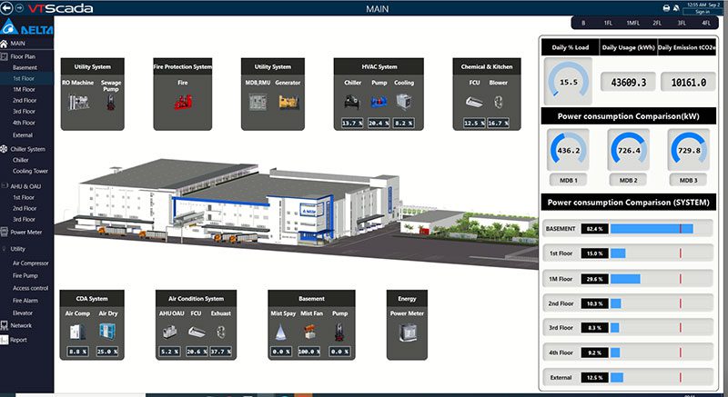 ระบบที่ขับเคลื่อนด้วยซอฟต์แวร์ VTScada ภายในเดลต้า โรงงานที่ 7 มีเป้าหมายเพื่อปรับปรุงการจัดการอาคาร รวมถึงลดการใช้พลังงานของการดำเนินงาน และการผลิตทั้งหมด ผู้จัดการสามารถใช้ระบบซอฟต์แวร์ทรงประสิทธิภาพนี้สำหรับการตรวจสอบ และการรายงานข้อมูลการใช้พลังงานอย่างละเอียดและยืดหยุ่น พร้อมกับอุปกรณ์ควบคุมอัตโนมัติของระบบปรับอากาศ HVAC ของโรงงาน นอกจากนี้ ข้อมูลแบบเรียลไทม์และการทำงานผ่านซอฟต์แวร์ ปราศจากการใช้กระดาษ ช่วยลดการทำงานในพื้นที่ ทั้งยังช่วยให้ผู้จัดการตัดสินใจบนพื้นฐานของข้อมูลอย่างเร็วขึ้น