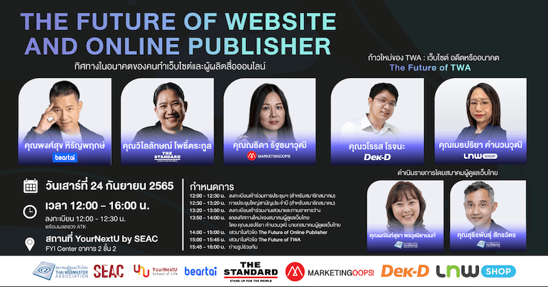 นอกจากการแถลงทิศทางใหม่ของสมาคมผู้ดูแลเว็บไทยแล้ว ยังมีงานเสวนาในหัวข้อ “The Future of Website and Online Publisher” ที่พูดคุยแลกเปลี่ยนประสบการณ์ มุมมอง ในการทำเว็บไซต์และสื่อออนไลน์ในช่วงที่ผ่านมาและแนวโน้มการเคลื่อนตัวในอนาคต