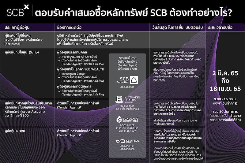 • “เอสซีบีเอกซ์” (SCBX) ประกาศทำคำเสนอซื้อหรือ Tender Offer หุ้นทั้งหมดของธนาคารไทยพาณิชย์ (SCB) กับผู้ถือหุ้นของ SCB เพื่อแลกกับหุ้นสามัญเพิ่มทุนที่ออกใหม่ของ SCBX ในอัตราการแลกหลักทรัพย์เท่ากับ 1 หุ้นสามัญของ SCB ต่อ 1 หุ้นสามัญของ SCBX และ 1 หุ้นบุริมสิทธิของ SCB ต่อ 1 หุ้นสามัญของ SCBX