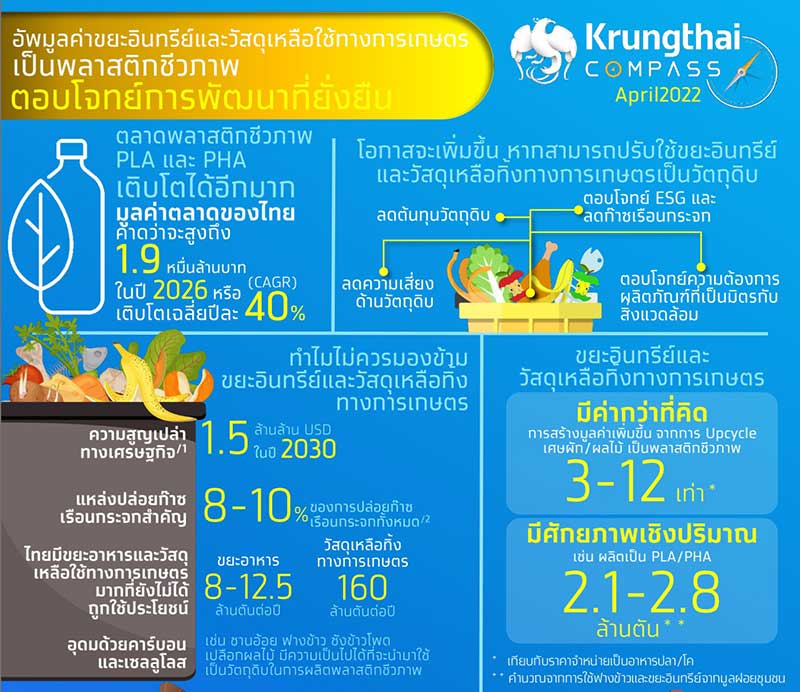 ผลกระทบด้านสิ่งแวดล้อมของขยะพลาสติก และพฤติกรรมผู้บริโภคที่ใส่ใจสิ่งแวดล้อมมากขึ้น เป็นโอกาสสำหรับอุตสาหกรรมการผลิตพลาสติกชีวภาพไทยเพื่อตอบรับเทรนด์รักษ์โลก ศูนย์วิจัย Krungthai COMPASS จึงแนะว่าผู้ประกอบการควรใช้ขยะอินทรีย์และวัสดุเหลือใช้ในภาคเกษตรจำนวนมากมาเป็นวัตถุดิบสำหรับการผลิตพลาสติกชีวภาพ PLA และ PHA