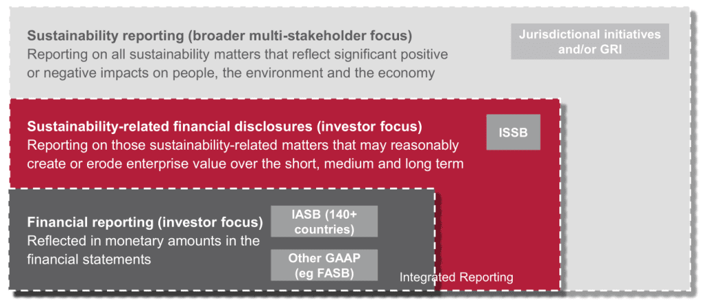 จะเห็นว่า ISSB Building Block เริ่มต้นจากการรายงานทางการเงินส่วนที่เป็นงบการเงิน (ตามมาตรฐาน IASB) ซึ่งเน้นสำหรับผู้ใช้รายงานที่เป็นผู้ลงทุน และเพิ่มเติมด้วยการเปิดเผยข้อมูลทางการเงินเกี่ยวกับความยั่งยืน (ตามมาตรฐาน ISSB) ซึ่งยังคงเน้นสำหรับผู้ใช้รายงานที่เป็นผู้ลงทุน โดยหากกิจการต้องการรายงานข้อมูลความยั่งยืนส่วนที่เป็นผลกระทบ (ทั้งทางบวกและทางลบ) จากการดำเนินงานที่มีต่อผู้คน สิ่งแวดล้อม และเศรษฐกิจ ซึ่งเน้นสำหรับผู้ใช้รายงานที่เป็นผู้มีส่วนได้เสียในวงกว้าง ควรใช้ข้อบังคับที่กำหนดโดยรัฐ (อาทิ มาตรฐาน ESRS) และ/หรือมาตรฐาน GRI