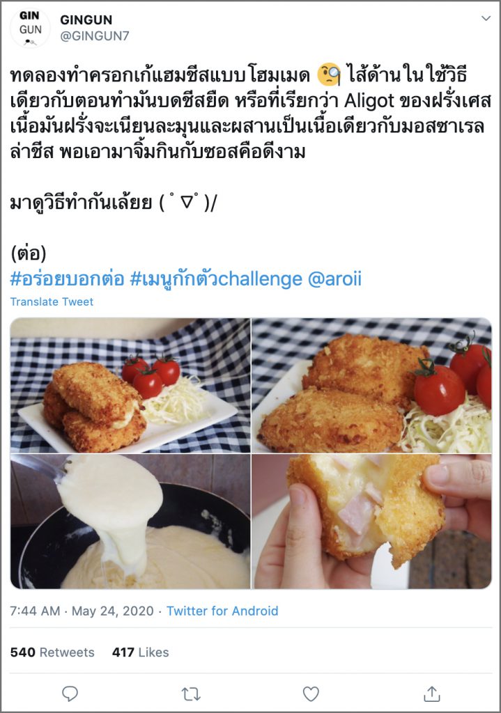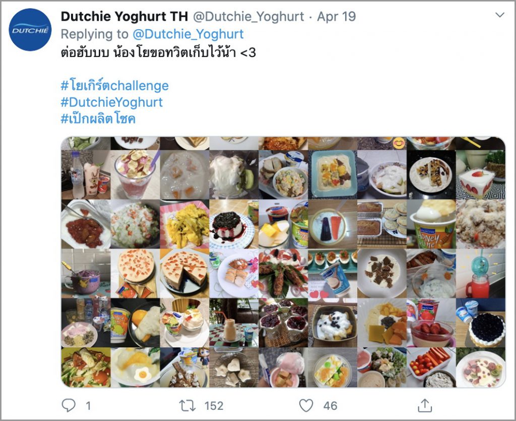 ความท้าทายในช่วงกักตัวนำพาให้นักชิมหรือสายกินในทวิตเตอร์มารวมตัวกันแล้วทวีตภาพความสำเร็จของการใช้ศาสตร์และศิลป์ในการทำอาหารด้วยการติดแฮชแท็ก #เมนูกักตัวchallenge ในขณะที่แบรนด์อย่าง Dutchie Yoghurt TH (@Dutchie_Yoghurt) ก็ไม่รอช้า เข้ามามีส่วนร่วมด้วยการเปิดตัวชาเลนจ์ในการนำโยเกิร์ตไปเป็นวัตถุดิบในเมนูอาหารจานอร่อยด้วยแฮชแท็ก #โยเกิร์ตChallenge