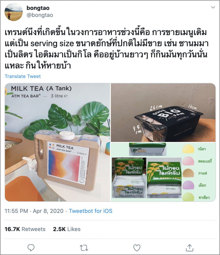 ข้อมูลจาก Brandwatch บริษัทรีเสิร์ชข้อมูลออนไลน์ระดับโลก ระบุว่า ระหว่างวันที่ 1 กุมภาพันธ์ ถึง 30 เมษายน 2563 ซึ่งเป็นช่วงกักตัวอยู่บ้าน #StayAtHome บทสนทนาเกี่ยวกับอาหารบนทวิตเตอร์ในประเทศไทยเพิ่มขึ้นถึง 56%