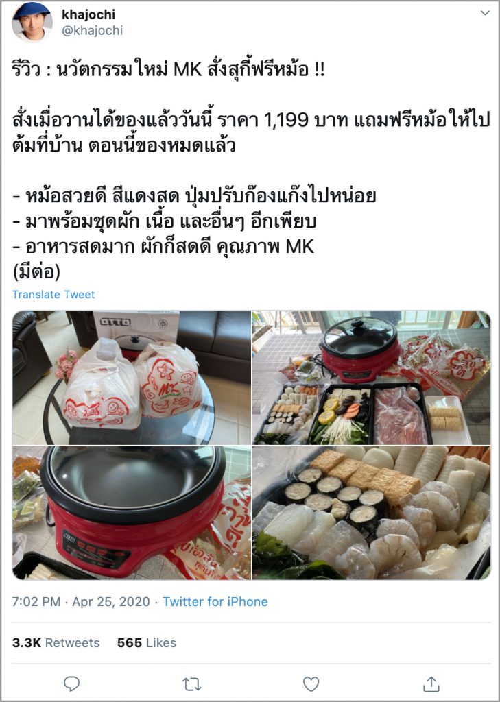 เทรนด์การทำอาหารกินเองที่บ้านทำให้คนหันมาสนใจอุปกรณ์เครื่องใช้ในครัวมากขึ้น อุปกรณ์ที่ไม่เคยอยู่ในสายตากลับกลายเป็นของที่ต้องมี ตั้งแต่หม้อทำอาหารสารพัดประโยชน์ หม้อทอดไร้น้ำมัน หม้อนึ่ง เครื่องปั่นอาหาร และอีกมากมาย ชาวทวิตภพกำลังตื่นเต้นกับแบรนด์อุปกรณ์เครื่องครัวใหม่ล่าสุดที่พวกเขาจะต้องเซฟเก็บไว้ อย่างเซ็ตสุกี้ MK ที่เป็นแบบพรีออร์เดอร์ซึ่งลูกค้าจะได้รับหม้อสุกี้แถมฟรีมาด้วย