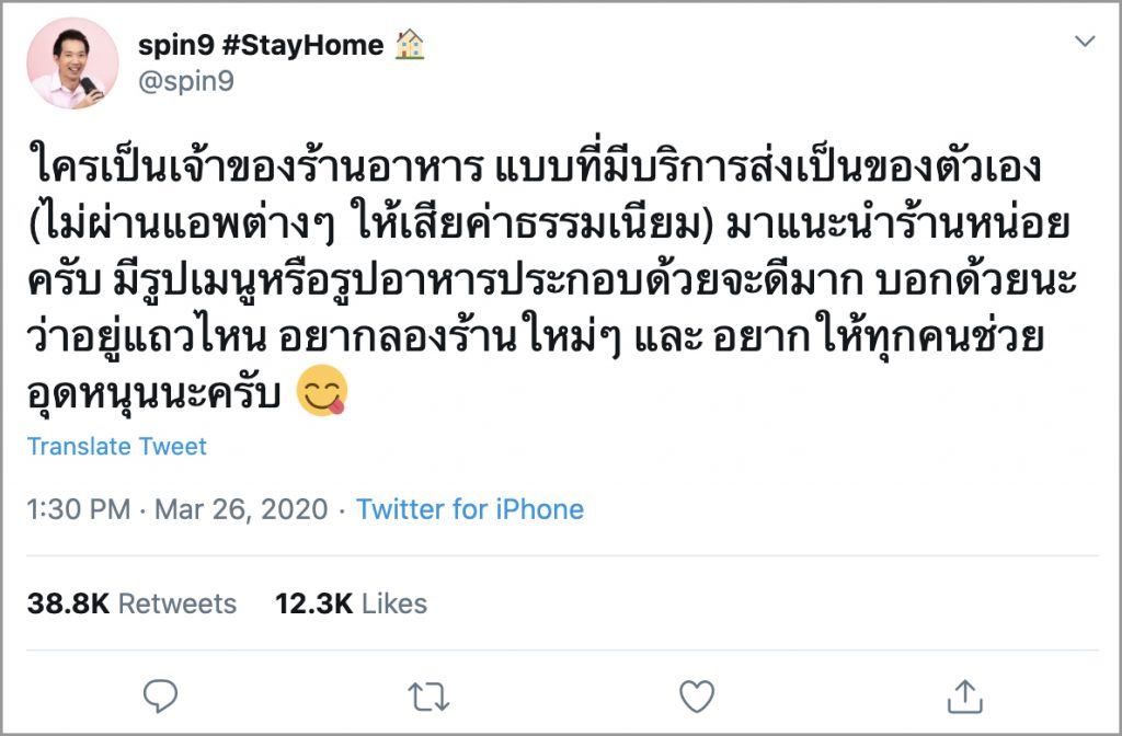 ในช่วงโควิด-19 มีผู้คนจำนวนมากที่ต้องตกงานทำให้พวกเขาหันมาทำอาหารขาย ชุมชนผู้ใช้งานทวิตเตอร์ชาวไทยต่างช่วยรีทวีตและช่วยโปรโมตร้านให้ด้วย อาทิ นักเขียนบทและนักแสดงชื่อดังอย่าง เต๋อ ฉันทวิชช์ (@terchantwist) ทวีตข้อความบอกว่าหากมีใครที่รู้จักคนที่ทำขนมหรืออาหารขายก็สามารถทวีตมาหาเขาได้ เขาจะช่วยซื้ออาหารเหล่านั้นแล้วนำไปมอบให้กับบุคลากรในโรงพยาบาล ส่วน อู๋ spin9 (@spin9) ก็ขอให้ฟอลโลเวอร์ช่วยแนะนำร้านอาหารออฟไลน์ที่ไม่ได้ขายผ่านแอปต่าง ๆ ใต้ทวีตของเขาเพื่อช่วยสนับสนุนให้ธุรกิจร้านอาหารเหล่านั้นได้มากขึ้น