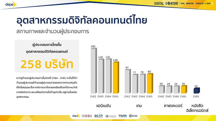 สำนักงานส่งเสริมเศรษฐกิจดิจิทัล หรือ ดีป้า ร่วมกับ สมาคมดิจิทัลคอนเทนต์ไทย (DCAT) สมาคมผู้ประกอบการแอนิเมชันและคอมพิวเตอร์กราฟิกไทย (TACGA) สมาคมอุตสาหกรรมซอฟต์แวร์เกมไทย (TGA) สมาคมธุรกิจบางกอกเอซีเอ็มซิกกราฟ (Bangkok ACM SIGGRAPH) และ บริษัท แอทไวส คอนซัลติ้ง จำกัด เผยผลสำรวจข้อมูลและประเมินสถานภาพอุตสาหกรรมดิจิทัลคอนเทนต์ไทย ประจำปี 2565 และคาดการณ์แนวโน้ม 3 ปี ระบุภาพรวมอุตสาหกรรมปี 2565 มีมูลค่ารวมอยู่ที่ 40,518 ล้านบาท เติบโตลดลง 4% สาเหตุจากการหดตัวของอุตสาหกรรมเกม แต่คาดว่าจะสามารถเติบโตต่อเนื่องแตะระดับ 44,983 ล้านบาทในปี 2568 ด้านผู้ประกอบการแนะภาครัฐควรเร่งยกระดับฝีมือแรงงานที่มีความเชี่ยวชาญในการพัฒนาดิจิทัลคอนเทนต์ไทย หากได้รับการส่งเสริมทั่วถึงจะนำซอฟต์พาวเวอร์ของไทย มาขับเคลื่อนเศรษฐกิจให้เติบโตได้