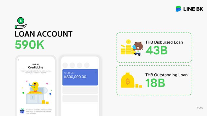 ด้านบริการยืมเงินจาก LINE BK ทั้ง 2 ประเภท ได้แก่ 1) บริการวงเงินให้ยืมและวงเงินให้ยืมนาโน ปัจจุบันมีลูกค้าใช้บริการกว่า 5.9 แสนบัญชี เติบโตขึ้น 81% เมื่อเปรียบเทียบปีต่อปี ยอดสินเชื่อคงค้างกว่า 18,000 ล้านบาท และมียอดการปล่อยสินเชื่อรวมตั้งแต่เปิดให้บริการมากกว่า 43,000 ล้านบาท โดยในช่วงครึ่งปีหลัง บริษัทฯ ยังคงมุ่งเน้นการเติบโตอย่างมีคุณภาพ และปรับปรุงระบบการคัดกรองลูกค้าให้มีประสิทธิภาพมากยิ่งขึ้น พร้อมจับมือกับพาร์ตเนอร์ทั้งใน LINE Ecosystem และพาร์ตเนอร์อื่นเพื่อร่วมมือปล่อยสินเชื่อให้กลุ่มลูกค้าใหม่ ๆ เพื่อกระตุ้นกำลังซื้อและต่อยอดทางธุรกิจ อีกทั้งยังมุ่งเน้น Customer Experience ให้เชื่อมกันแบบไร้รอยต่อ สะดวกสบายกับลูกค้ามากที่สุด