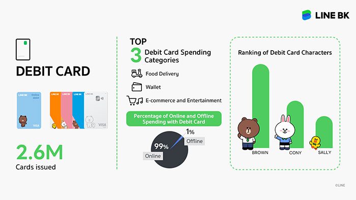 - บัตรเดบิต จำนวน 2.6 ล้านบัตร เติบโตขึ้น 93% เมื่อเปรียบเทียบปีต่อปี โดยหมวดหมู่ที่ลูกค้าใช้จ่ายมากที่สุด ได้แก่ ฟู้ดเดลิเวอรี่ วอลเล็ท อีคอมเมิร์ซและเอ็นเตอร์เทนเม้นท์ ซึ่งเป็นการใช้เพื่อชำระค่าสินค้าและบริการบนออนไลน์ถึง 99% สำหรับดีไซน์บัตรเดบิตที่ได้รับความนิยมสูงสุด คือ หมี BROWN