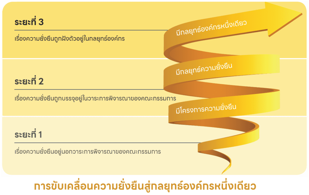 แม้ในระยะเริ่มต้น กิจการจะมีความริเริ่มด้านความยั่งยืนในลักษณะที่เป็นโครงการ/กิจกรรม แยกต่างหากจากกระบวนงานทางธุรกิจปกติ มิได้มีความเชื่อมโยงซึ่งกันและกัน แต่เมื่อเริ่มเข้าใจว่าเรื่องความยั่งยืนเป็นประเด็นสาระสำคัญที่ต้องดำเนินการ กิจการจะมีการตั้งคณะกรรมการชุดย่อยเพื่อกำหนดกลยุทธ์ในการขับเคลื่อนเรื่องความยั่งยืน และจะมีตัวชี้วัดใช้สำหรับประเมินผลงาน ดำเนินไปจนกระทั่งมาถึงจุดที่เรื่องความยั่งยืนจะถูกหลอมรวมเป็นส่วนหนึ่งของกลยุทธ์องค์กร เป็นกลยุทธ์ชุดเดียวกันกับที่ใช้ขับเคลื่อนองค์กรโดยรวม