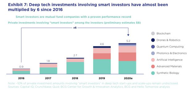 นักลงทุนเริ่มตระหนักถึงศักยภาพของธุรกิจ DeepTech ถึงแม้ว่าจะมีความเสี่ยงด้านเทคโนโลยีสูง แต่ก็ถือว่ามีความเสี่ยงทางการตลาดต่ำ ตามประมาณการเบื้องต้น เห็นได้จากการระดมทุนของ DeepTech เพิ่มขึ้นเป็นอย่างมากตั้งแต่ปี 2016 ถึงปี 2020 จาก $15B เพิ่มขึ้นมากกว่า $60B การเพิ่มจำนวนต่อการลงทุนจาก $360K ถึง $2M ระหว่างปี 2016 ถึง 2019 การประมาณการเบื้องต้นบ่งชี้ว่าการลงทุนใน DeepTech โดย “Smart Investors” เพิ่มขึ้นจาก $0.9B เป็น $5.2B ระหว่างปี 2016 และปี 2020