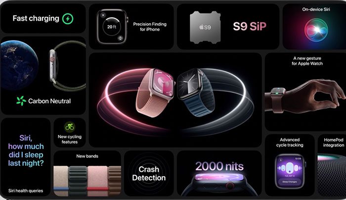 Apple เปิดตัว Apple Watch Series 9 ที่มาพร้อมประสิทธิภาพและความสามารถที่เพิ่มขึ้น, คำสั่งนิ้ว “แตะสองครั้ง” ใหม่, จอภาพที่สว่างขึ้น, Siri บนอุปกรณ์ที่เร็วขึ้น, ความสามารถใหม่ในการเข้าถึงและบันทึกข้อมูลสุขภาพ ตลอดจนคุณสมบัติค้นหาตำแหน่งที่ตั้งจริงสำหรับ iPhone และอีกมากมาย Apple Watch Series 9 ขับเคลื่อนโดย watchOS 10 ซึ่งมาพร้อมแอปที่ออกแบบใหม่, Smart Stack ใหม่, หน้าปัดนาฬิกาแบบใหม่, คุณสมบัติการปั่นจักรยานและการเดินเขาใหม่ และเครื่องมือเพื่อสนับสนุนด้านสุขภาพจิต