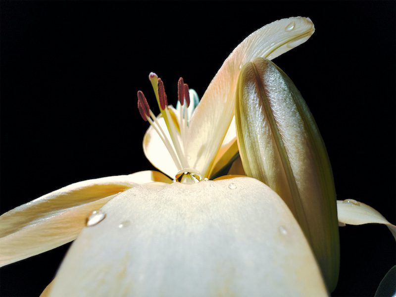 Daniel Olah: “ความตั้งใจของผมก็คือการเน้นที่หยดน้ำเล็ก ๆ เพื่อเปรียบเทียบกับดอกลิลี่. ผมใช้ไฟสตูดิโอส่องเฉพาะจุดที่ดอกลิลี่และให้พื้นหลังมืด ผมใช้ไฟสตูดิโอส่องเฉพาะจุดที่ดอกลิลี่และให้พื้นหลังมืด ซึ่งกลีบดอกที่อยู่ข้างล่างช่วยดึงจุดสนใจให้อยู่ที่ส่วนกลางภาพ และขับเน้นไม่เพียงแต่หยดน้ำ แต่ที่เกสรตัวผู้ด้วย อย่างไรก็ดี ภาพก็มีจังหวะที่สร้างให้เกิดองค์ประกอบที่ชวนให้เคลิบเคลิ้ม”