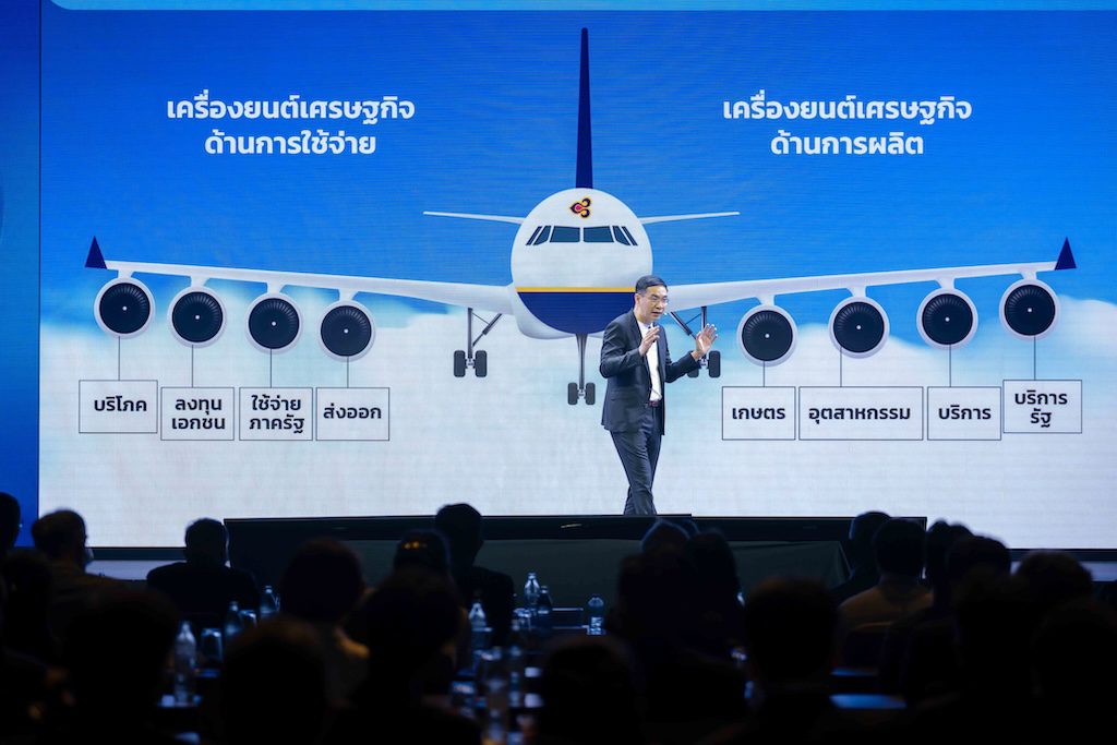 ดร.สมเกียรติ เปรียบเทียบโครงสร้างเศรษฐกิจไทยเสมือนเครื่องบินที่มี 4 เครื่องยนต์ ได้แก่ การบริโภค การลงทุนภาคเอกชน การใช้จ่ายภาครัฐ และการส่งออก ที่ผ่านมาภาครัฐมุ่งเน้นการกระตุ้นฝั่งการใช้จ่ายจนเกินกำลัง (Overload) ทั้งที่หนี้ครัวเรือนและหนี้สาธารณะอยู่ในระดับสูง ในขณะที่เครื่องยนต์ฝั่งการผลิต (ภาคเกษตร อุตสาหกรรม และบริการ) กลับมีศักยภาพลดต่ำลง ดังนั้น แนวทางแก้ไขจึงไม่ใช่การอัดฉีดเงินกระตุ้นเศรษฐกิจระยะสั้น แต่คือการปรับโครงสร้างภาคการผลิตให้แข็งแกร่ง เปรียบเสมือนการฟื้นฟูกิจการของ “การบินไทย” ที่ต้องแก้ปัญหาที่รากฐานการดำเนินงาน