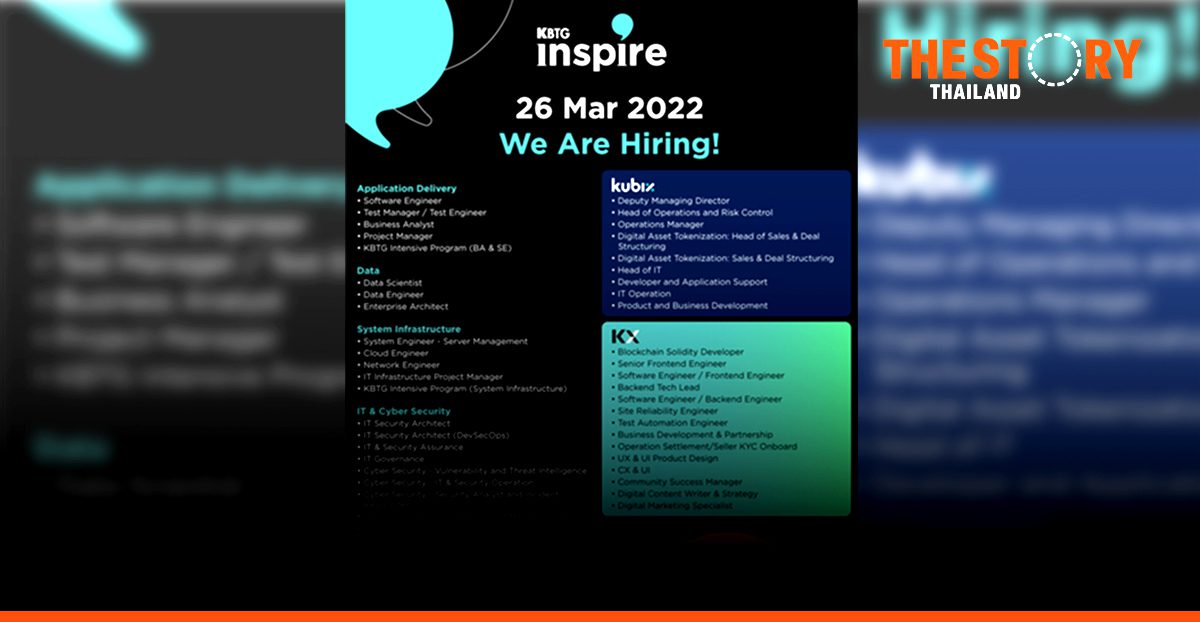 Individuals who would like to participate in KBTG Inspire Season 2 and join KBTG can submit their resumes for their desired positions via www.kbtginspire.com from today until March 22, 2022, to automatically join KBTG Inspire on Saturday, March 26, 2022. This year, KBTG has up to 55 job openings in Dev, Data Infrastructure, Design, Cyber & IT Security, as well as other support positions and many other interesting positions in new business units like Kubix, an ICO portal service provider which recently unveiled the DESTINY TOKEN, the first digital token of its kind; and KASIKORN X (KX), a new S-curve factory that has just debuted Coral – a non-fungible token (NFT) marketplace platform. Regarding the job application process at KBTG, applicants with qualifications matching the details specified for the positions will be contacted, then proceed to the test/interview round.