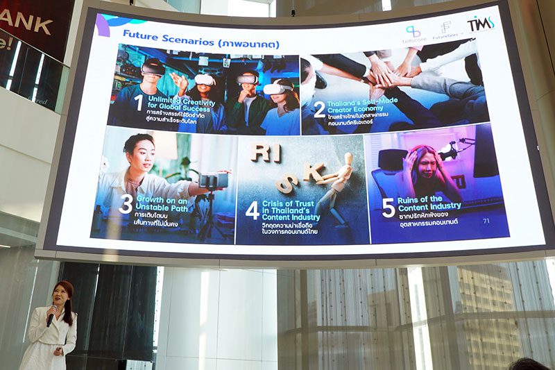 ภาพอนาคตที่ 5: ซากปรักหักพังของอุตสาหกรรมคอนเทนต์ ประเทศไทยเข้าสู่ยุคตกต่ำของเศรษฐกิจคอนเทนต์ครีเอเตอร์ จากการใช้เทคโนโลยีในทางที่ผิดซึ่งส่งผลให้เกิดการหลอกลวง ข่าวปลอมและการปลอมแปลงตัวตน เป็นปัญหาที่ทำให้เกิดผลเสียต่อเศรษฐกิจและอาชีพ ไม่มีการกำกับดูแลแพลตฟอร์มต่างชาติในไทย ทำให้รายได้และข้อมูลรั่วไหลออกนอกประเทศ