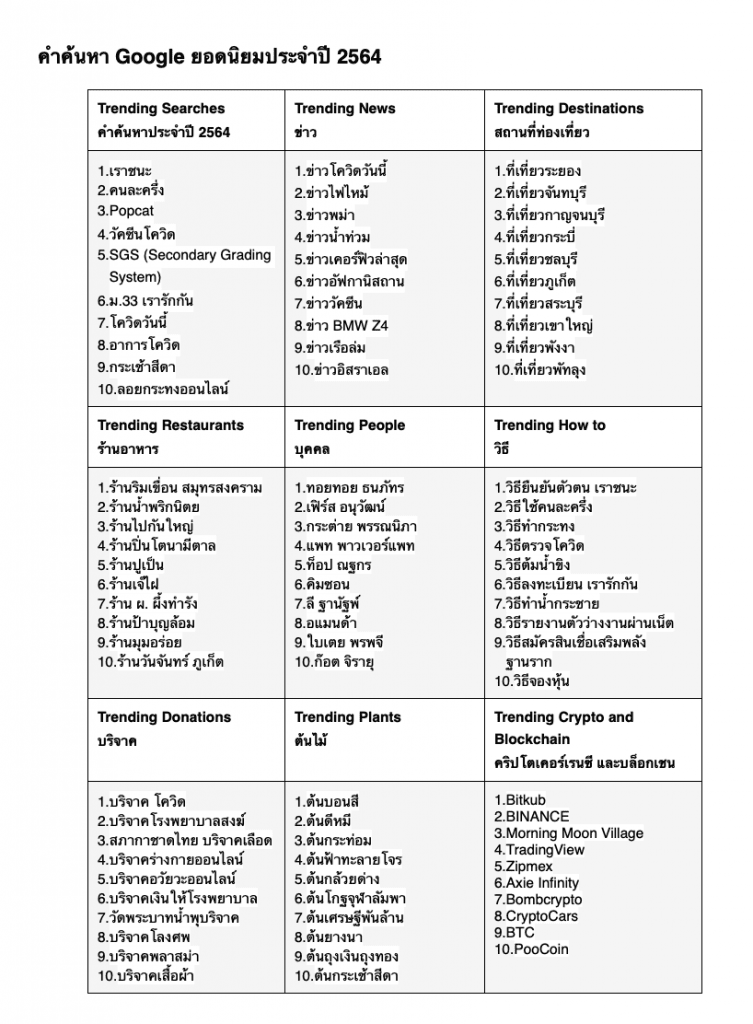 Google ประเทศไทย ประกาศคำค้นหายอดนิยมประจำปี 2564 ที่แสดงให้เห็นถึงภาพรวมของตลอดทั้งปีที่ผ่านมา ที่ผ่านสายตาและจากคำค้นหาของผู้คนในประเทศไทย รวมทั้งการใช้ข้อมูลจาก Google Trends ที่นำเสนอมุมมองที่โดดเด่นและการเปลี่ยนแปลงพฤติกรรมการค้นหาของผู้คนตลอดทั้งปี ซึ่งมีผลมาจากเหตุการณ์สำคัญต่าง ๆ ที่เกิดขึ้น ตลอดจนเทรนด์การค้นหาเพื่อช่วยการเยียวยาที่มาแรงในประเทศไทยในปีนี้