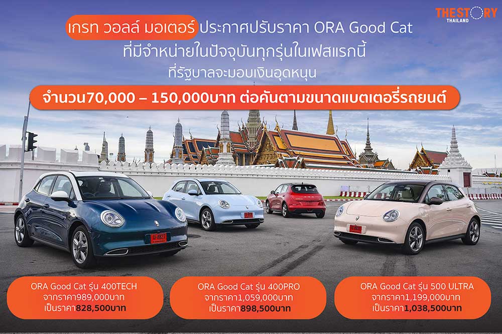 เพื่อตอบโจทย์ความต้องการและประสบการณ์ด้านการขับขี่รถยนต์ไฟฟ้าของผู้บริโภคชาวไทย เกรท วอลล์ มอเตอร์ มีความยินดีและพร้อมที่จะสนับสนุนนโยบายของรัฐและทุกภาคส่วน เพื่อร่วมเป็นอีกหนึ่งกำลังสำคัญในการส่งเสริม สร้างสรรค์ และพัฒนาอุตสาหกรรมยานยนต์ไฟฟ้าไทย เพื่อให้เกิดการใช้งานรถยนต์ไฟฟ้าที่สะอาด ปลอดภัย เป็นมิตรต่อสิ่งแวดล้อม และยกระดับสู่การเป็นศูนย์กลางของอาเซียนได้อย่างเป็นรูปธรรม การปรับลดราคา ORA Good Cat ทุกรุ่น รวมไปถึงสิทธิพิเศษต่างๆ ที่เรามอบให้กับลูกค้าในครั้งนี้ ยังสะท้อนถึงคำมั่นสัญญาที่เราให้ไว้ว่าจะรับฟังเสียงของทุกคนเพื่อสร้างประสบการณ์อันยอดเยี่ยมให้กับลูกค้าของเรา”