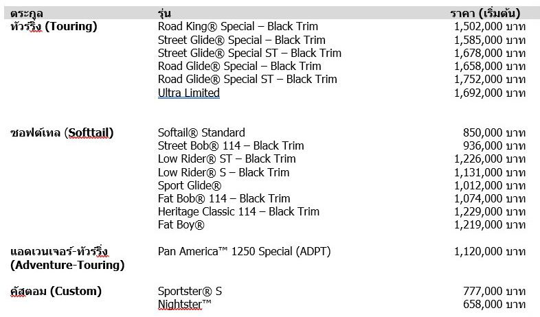 ในปี 2023 Harley-Davidson แบรนด์อันเป็นที่ใฝ่ฝันของนักบิดทั่วโลก นำรถมอเตอร์ไซค์รุ่น Carryover ในโครงสีใหม่ ได้แก่ รถมอเตอร์ไซค์รุ่น Sportster S รุ่น Nightster™ รุ่น Street Glide® Special รุ่น Street Glide® ST รุ่น Fat Boy® 114 รุ่น Road King® Special รุ่น Road Glide® Special รุ่น Road Glide® ST รุ่น Road Glide® Limited รุ่น Ultra Limited และรุ่น Pan America™ 1250 Special เหล่าแฟน ๆ และเหล่านักขับขี่หน้าใหม่ของแบรนด์นี้สามารถยลโฉมรถมอเตอร์ไซค์รุ่นลิมิเต็ดเอดิชัน และรถมอเตอร์ไซค์รุ่น Carryover ในโครงสีใหม่ ในราคาเริ่มต้นที่ 658,000 บาท