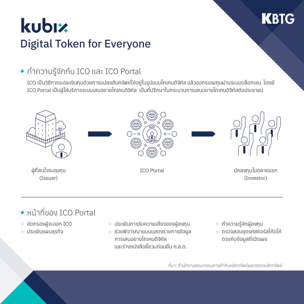 ทั้งนี้ ตลาดโทเคนดิจิทัลจะดำเนินการผ่านเทคโนโลยีบล็อกเชนจึงมีความปลอดภัยสูง และมีความยืดหยุ่นมากกว่าตลาดเพื่อการลงทุนในปัจจุบัน ซึ่งทำให้การลงทุนในโทเคนดิจิทัลผ่าน ICO Portal มีความน่าสนใจอย่างมาก เนื่องจากผู้ลงทุนจะได้รับสิทธิประโยชน์อื่นที่นอกเหนือจากผลตอบแทนที่เป็นตัวเงิน โดยการดำเนินธุรกิจนี้ จะอยู่ภายใต้การกำกับดูแลของสำนักงานคณะกรรมการกำกับหลักทรัพย์และตลาดหลักทรัพย์ (ก.ล.ต.) สำหรับผู้ที่สนใจจะระดมทุนหรือลงทุนในสินทรัพย์ดิจิทัลศึกษาข้อมูลเพิ่มเติมได้ทางเว็บไซต์ www.kubix.co