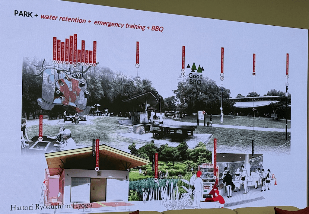 ความใส่ใจในรายละเอียดยังแทรกซึมไปถึง เฟอร์นิเจอร์เมือง (Urban Furniture) สิ่งที่เราเห็นเป็นม้านั่งในสวนธรรมดาที่ผู้สูงอายุนั่งพักผ่อน แท้จริงแล้วถูกออกแบบให้มีฟังก์ชันซ่อนเร้น เมื่อเกิดภัยพิบัติและก๊าซหุงต้มถูกตัดขาด เราสามารถพลิกที่นั่งออก ฐานด้านล่างจะกลายเป็นเตาหุงต้ม (Kamado bench) สำหรับประกอบอาหารแจกจ่ายผู้ประสบภัยได้ทันที หรือแม้แต่สวนหย่อมเล็ก ๆ (Pocket Parks) ในชุมชน ก็ถูกออกแบบให้มีท่อระบายน้ำที่พร้อมสำหรับการติดตั้งกระโจมสุขาชั่วคราว (Manhole toilets) เพื่อสุขอนามัยในยามวิกฤต