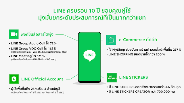 LINE ครบรอบ 10 ปี ขอบคุณทุกผู้ใช้พร้อมตอกย้ำความสำเร็จบนเส้นทางการเป็นแพลตฟอร์มหนึ่งเดียวที่ครองใจคนไทยตลอดทศวรรษที่ผ่านมา จากการยกระดับชีวิตดิจิทัลได้ตั้งแต่ตื่นจนเข้านอน พร้อมเป็นแพลตฟอร์ม Chat Commerce ที่แข็งแกร่งที่สุดเพื่อธุรกิจเติบโตเต็มกำลัง ผลักดันศักยภาพแบรนด์และผู้ประกอบการไทยทุกระดับด้วยพลังของ LINE ECOSYSTEM เพื่อประสบการณ์การใช้งานแพลตฟอร์มที่สมบูรณ์