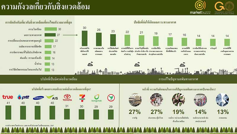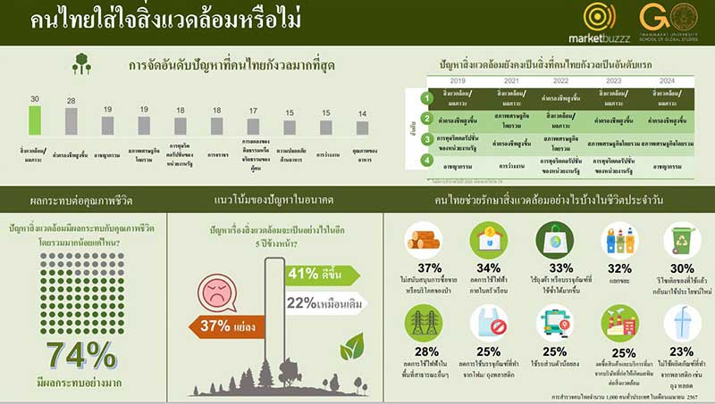 มาร์เก็ตบัซซ์ ร่วมกับ มหาวิทยาลัยธรรมศาสตร์ เผยผลสำรวจปี 2567 “5 อันดับแรกของความกังวลต่อสาธารณะ” มีผู้ตอบแบบสอบถาม จำนวน 1,000 คน ในเดือนเมษายน 2567 พบว่า สิ่งแวดล้อม ยังคงติดอันดับสิ่งที่คนไทยกังวลมากที่สุด คิดเป็นร้อยละ 30 ของผู้ตอบแบบสอบถาม รองลงมาคือเรื่องของค่าครองชีพ คิดเป็นร้อยละ 28 ของผู้ตอบแบบสอบถาม ซึ่งทั้งสองหัวข้อนี้ก็เป็นสิ่งที่คนไทยกังวลมากที่สุดจากการสำรวจในปี 2566 เช่นกัน โดยการสำรวจนี้อยู่ในบริบทที่เกี่ยวกับความกังวลหลักๆ ของประชาชนที่มีต่อประเทศ ซึ่งรวมถึงการทุจริตคอร์รัปชั่นของหน่วยงานรัฐ, งานสาธารณสุข, การจราจร, อาชญากรรมและสภาพเศรษฐกิจโดยรวม