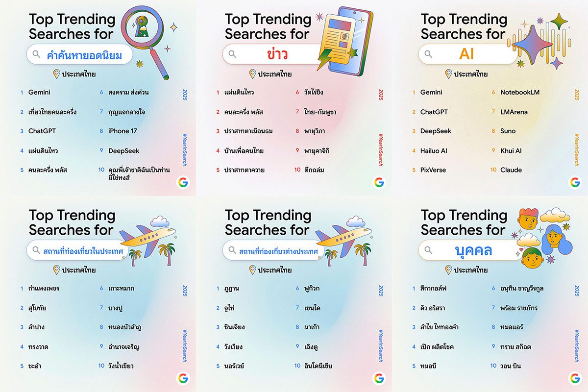 ผลการค้นหายอดนิยมประจำปี 2568 พบว่าคำว่า “Gemini” ซึ่งเป็นเครื่องมือ AI จาก Google ครองอันดับ 1 คำค้นหายอดนิยมประจำปี สะท้อนถึงการเติบโตอย่างก้าวกระโดดของการใช้เครื่องมือ AI ในประเทศไทย