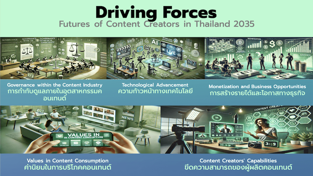 โดยทางวิพัตรา กล่าวว่า ทางทีมวิจัยได้ใช้กระบวนการ Foresight ซึ่งเป็นการมองอนาคตและวิเคราะห์อย่างเป็นระบบ ซึ่งช่วยให้เรามองเห็นภาพอนาคตของวงการคอนเทนต์ครีเอเตอร์ได้อย่างชัดเจน ทั้งในแง่ที่ดีที่สุดและแย่ที่สุด โดยอ้างอิงจากการวิเคราะห์เทรนด์และปัจจัยขับเคลื่อนสำคัญต่างๆ เช่น สถานการณ์ปัจจุบันที่ยังมีปัญหาบางส่วนที่ยังไม่ได้รับการแก้ไข และโอกาสที่ยังมีอยู่ในตลาด ซึ่งปัจจัยดังกล่าวจะมีอยู่ด้วยกัน 5 เรื่อง ได้แก่