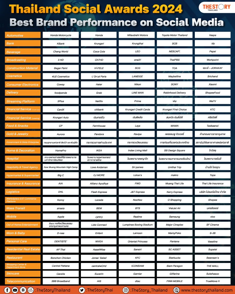รายชื่อผู้เข้าชิงกลุ่มรางวัล Best Brand Performance on Social Media จำนวน 31 สาขา ได้แก่