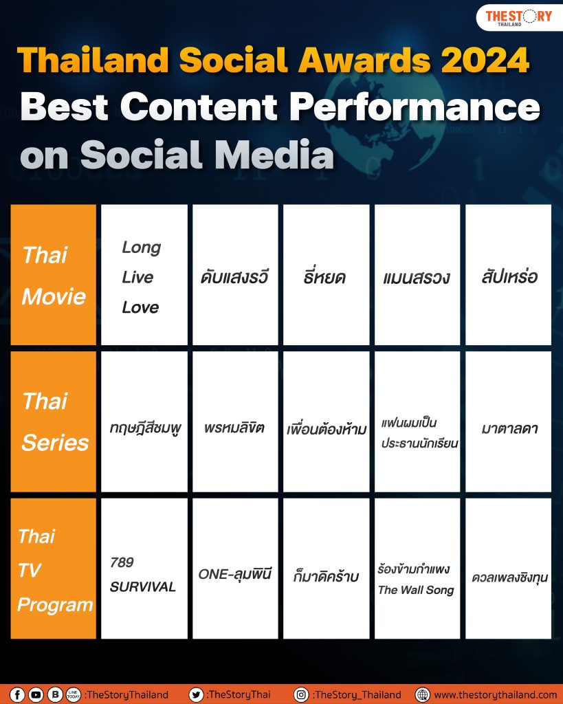 รายชื่อผู้เข้าชิงกลุ่มรางวัล Best Content Performance on Social Media จำนวน 3 สาขา ได้แก่
