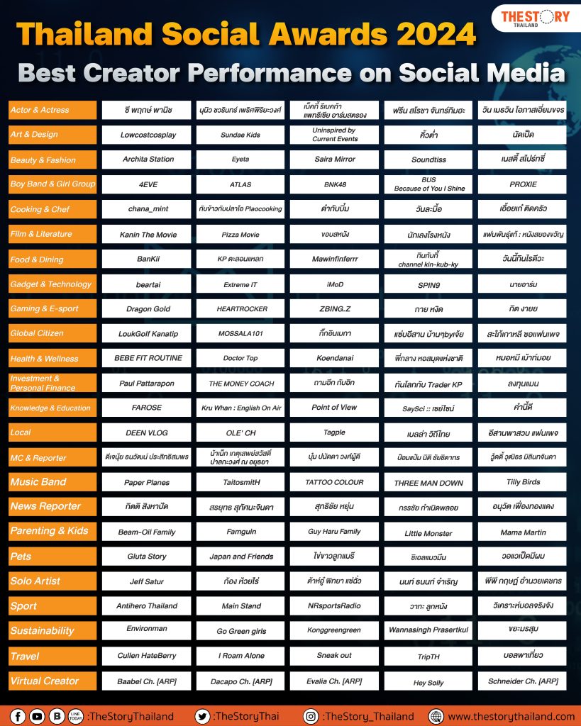 รายชื่อผู้เข้าชิงกลุ่มรางวัล Best Creator Performance on Social Media จำนวน 24 สาขา ได้แก่