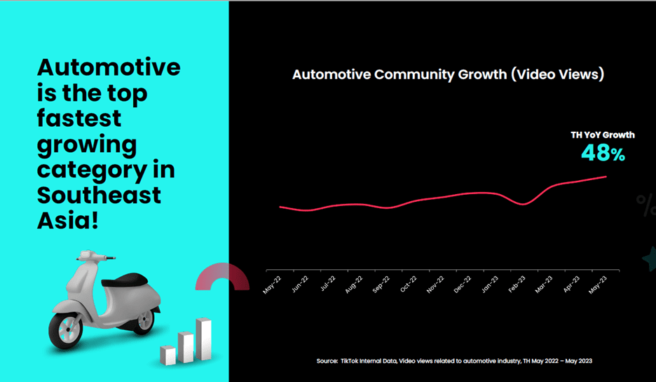 ในปี 2566 TikTok ไม่เพียงแต่ปฏิวัติวงการช้อปปิ้งและความบันเทิงเท่านั้น แต่ยังมีอิทธิพลอย่างมากต่ออุตสาหกรรมยานยนต์และการเงินอีกด้วย โดย ‘Automotive Unboxed‘ แสดงให้เห็นถึงบทบาทของ TikTok ในการเปลี่ยนแปลงอุตสาหกรรมยานยนต์ ด้วยการเป็นแพลตฟอร์มที่ขับเคลื่อนการมีส่วนร่วมอย่างที่ไม่เคยเกิดขึ้นมาก่อน และมีอิทธิพลต่อการตัดสินใจของผู้บริโภคในการซื้อยานพาหนะ สะท้อนการเติบโตกว่า 48% ของยอดดูวิดีโอที่เกี่ยวข้องกับเนื้อหาเกี่ยวกับยานยนต์ในประเทศไทยเมื่อเทียบเป็นรายปีซึ่งตอกย้ำการขยายตัวอย่างรวดเร็วของหมวดหมู่นี้ ควบคู่ไปกับข้อมูลเชิงลึกที่ยังเผยให้เห็นว่าผู้ใช้ TikTok มากกว่า 40% ที่เป็นรวมไปถึงผู้ที่มีอายุมากกว่า 35 ปีมีส่วนร่วมอย่างแข็งขันกับเนื้อหาเกี่ยวกับยานยนต์ ซึ่งหลายคนอาจเป็นผู้ซื้อรถยนต์รายใหม่ที่ได้รับอิทธิพลจากเนื้อหาของ TikTok