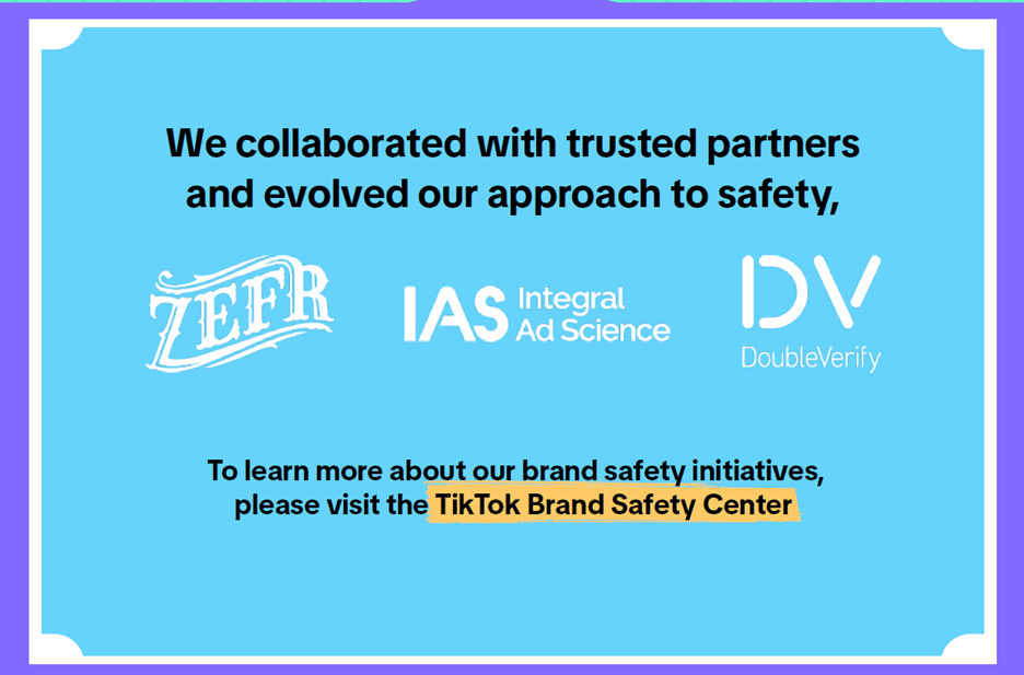 • ความปลอดภัยของแบรนด์: TikTok ทุ่มเทในเรื่องความปลอดภัยของแบรนด์มาอย่างต่อเนื่อง แพลตฟอร์มได้ก่อตั้ง TikTok Brand Safety Center เพื่อนำเสนอโซลูชันด้านความปลอดภัยและความเหมาะสมของแบรนด์ขั้นสูงที่สร้างขึ้นสำหรับ TikTok โดยเฉพาะ โครงการริเริ่มนี้สะท้อนให้เห็นถึงความพยายามของแพลตฟอร์มในการสร้างสภาพแวดล้อมเชิงบวก ปลอดภัย และเหมาะสมสำหรับธุรกิจผ่านการใช้โซลูชันที่ทันสมัย และความร่วมมือกับพันธมิตรด้านเทคโนโลยีชั้นนำ รวมถึงองค์กรต่าง ๆ ในอุตสาหกรรม ซึ่งโซลูชันที่มีประสิทธิภาพนี้ได้รับการออกแบบมาเพื่อให้แบรนด์สามารถควบคุมประสบการณ์การโฆษณาบนแพลตฟอร์มได้มากขึ้น และยังสามารถมั่นใจได้ว่าโฆษณาของคุณจะแสดงในสภาพแวดล้อมที่เชื่อถือได้ซึ่งสอดคล้องกับคุณค่าและเอกลักษณ์ของแบรนด์