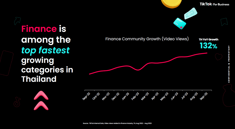 แบรนด์การเงินต่าง ๆ ยังได้รับผลลัพธ์ที่น่าประทับใจจากการใช้แนวทางการตลาดแบบครบวงจรและกลยุทธ์ที่สร้างสรรค์บน TikTok สามารถตอบโจทย์ผู้ใช้งานที่หลากหลายของ TikTok ในประเทศไทยได้อย่างลึกซึ้ง ข้อมูลเชิงลึกเหล่านี้เป็นตัวช่วยตอกย้ำถึงบทบาทความสำคัญของ TikTok ในการกำหนดพฤติกรรมผู้บริโภคกลุ่มต่างๆ ทำให้เกิดคอมมูนิตี้ที่มีชีวิตชีวา ทรงความรู้ และมีส่วนร่วม